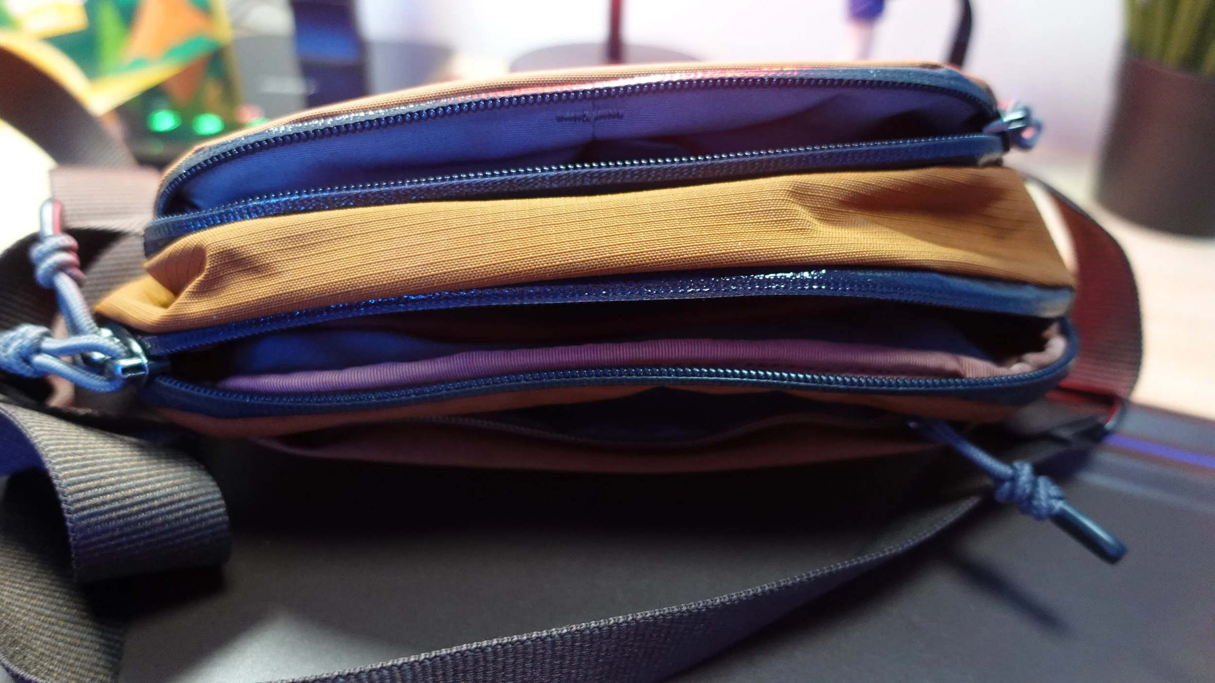 Made with polyester and nylon, on the inside and recycled fabric on the outside that is water resistant, this particular bag also seals the zippers with a coating to resist water. Frankly, I don’t particularly like the sheen emanating off the zipper, but the benefits from a water seal completely outweighs my aesthetic preferences. Overall the bag doesn’t feel particularly premium, but that’s also to be expected from the recycled fabric material that many bag makers have transitioned over to. It doesn’t really stand out much in this Bronze colorway, but that might be a good thing for people who don’t want attention drawn to where their important personal belongings are stored.