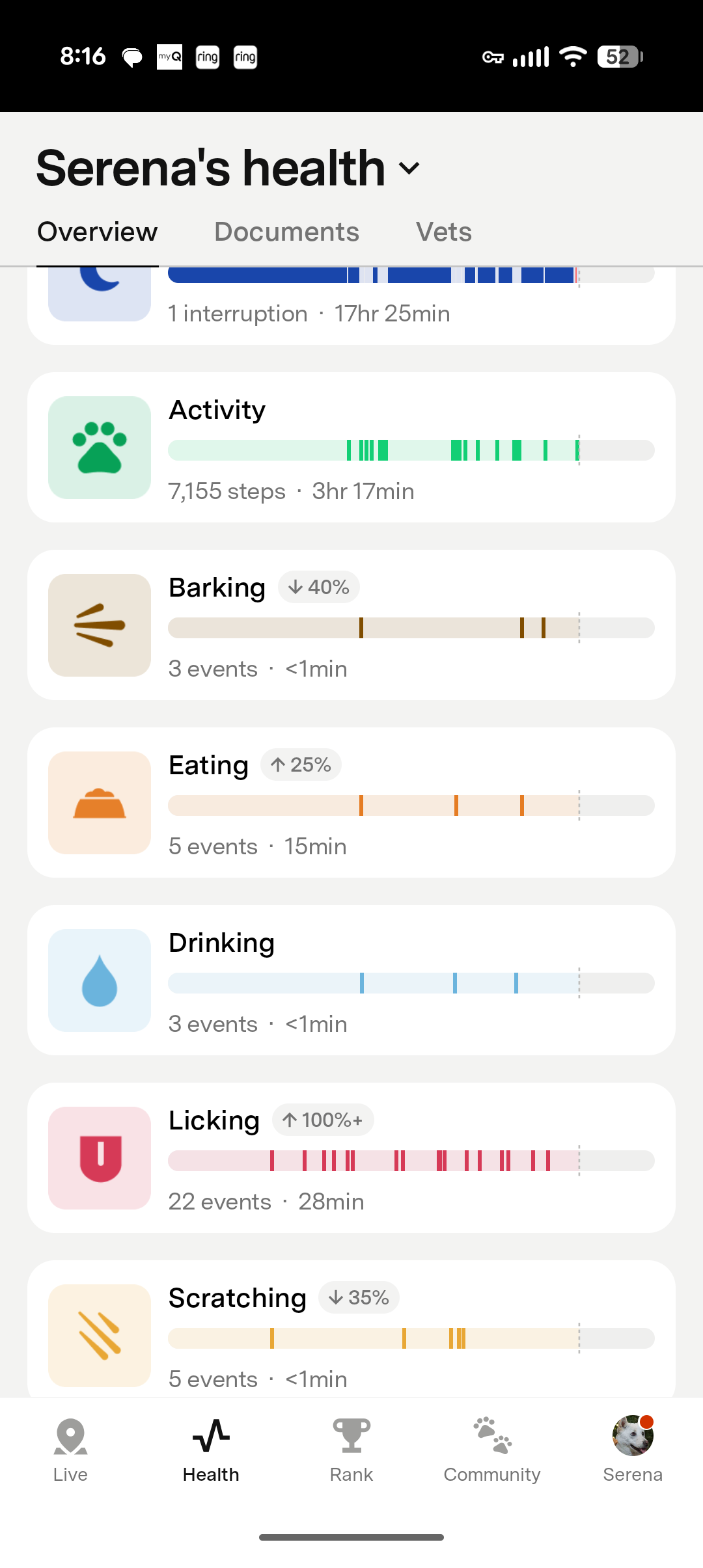 As a dog owner, you for sure know when your dog is eating because you’re likely the one feeding them. You’ll know how many meals they’ve had in a day. Drinking water is also a somewhat easy to track offline as you can just see if the bowl of water you set for your dog is empty by the end of a day. But no matter how much time in a day you spend with your animal, they’ll scratch and lick countless of times that you’ll miss. This makes it helpful for me– especially with aging dogs that go outside a lot– to know if they are scratching or licking at higher rates than normal. These features are only exclusive to the Series 3+ and are blocked off on the app for prior models of Fi collars.