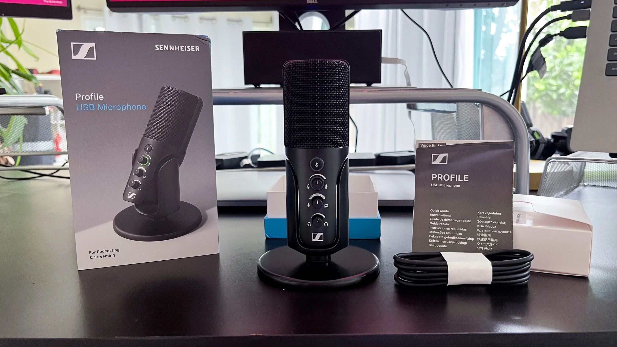 The mic is sleek and looks very professional, with an all-metal housing and table stand in black, with a black metal mesh screen. In the hand, it feels substantial and seems to be made of high quality materials. Along with the mic and table stand, the box included a 1.2 meter USB-C to USB-C cable, quick start guide, and safety guide. For the full user manual, you’ll have to scan the QR code in the quick start guide. Sennheiser also offers a more expensive package option, the “Streaming Set,” that also includes a boom arm and a 3 meter cable.